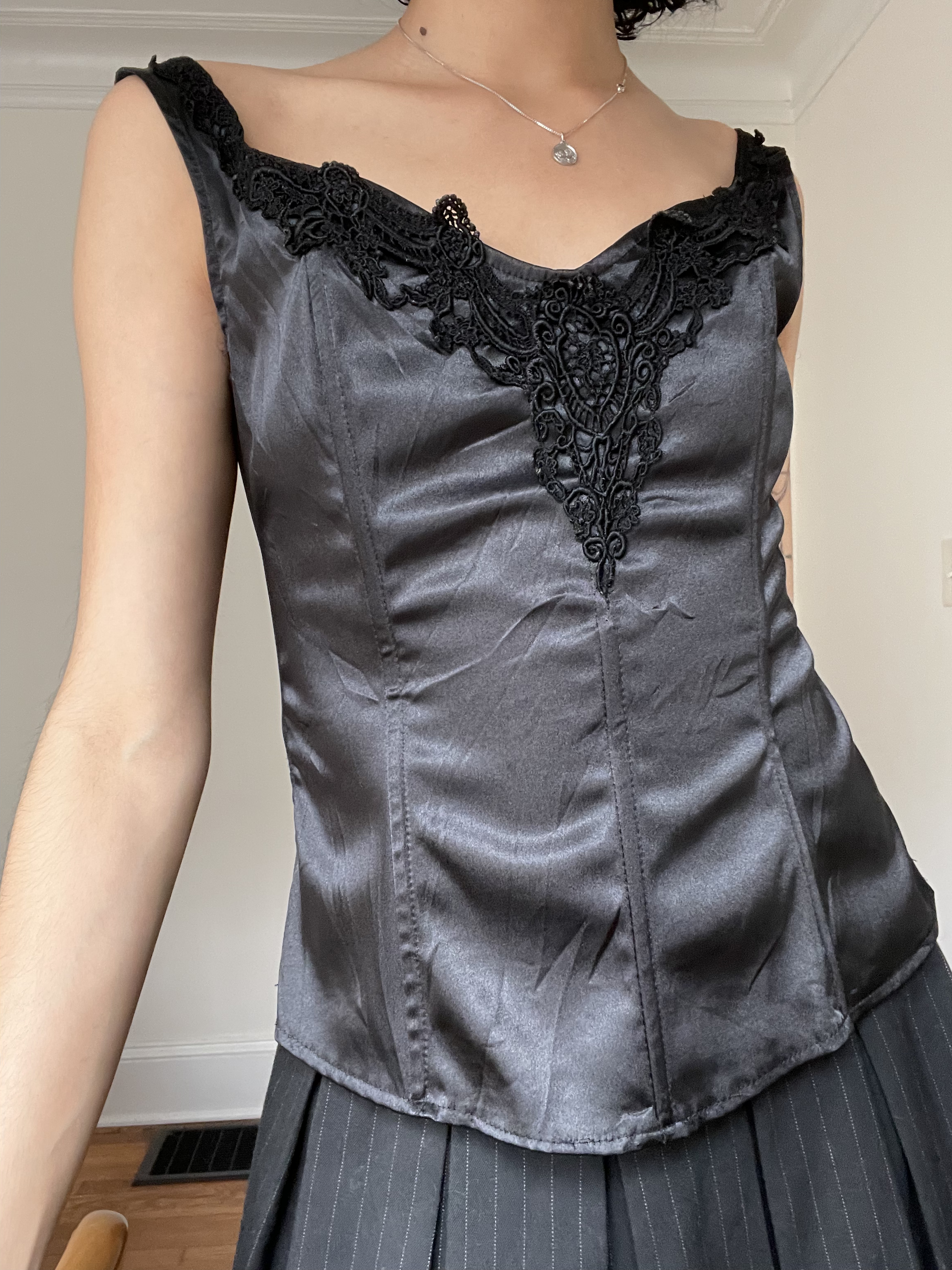 By Morbid Threads. Black satin corset with boning and embroidered details. With a zip up closure on the back. Labeled a size M