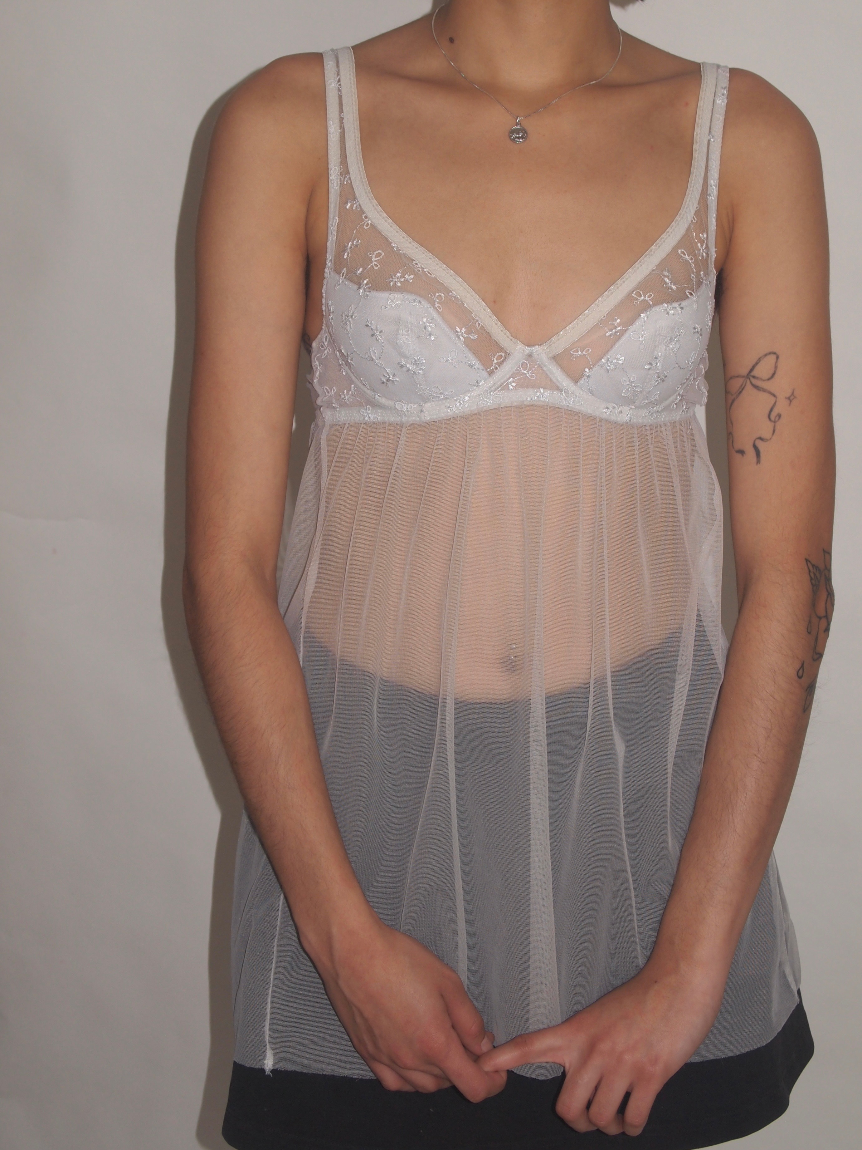 White eyelet bustier lingerie babydoll slip top with a sheer mesh panel. Ideal for a XS/S, 32-36” bust, A-B cup