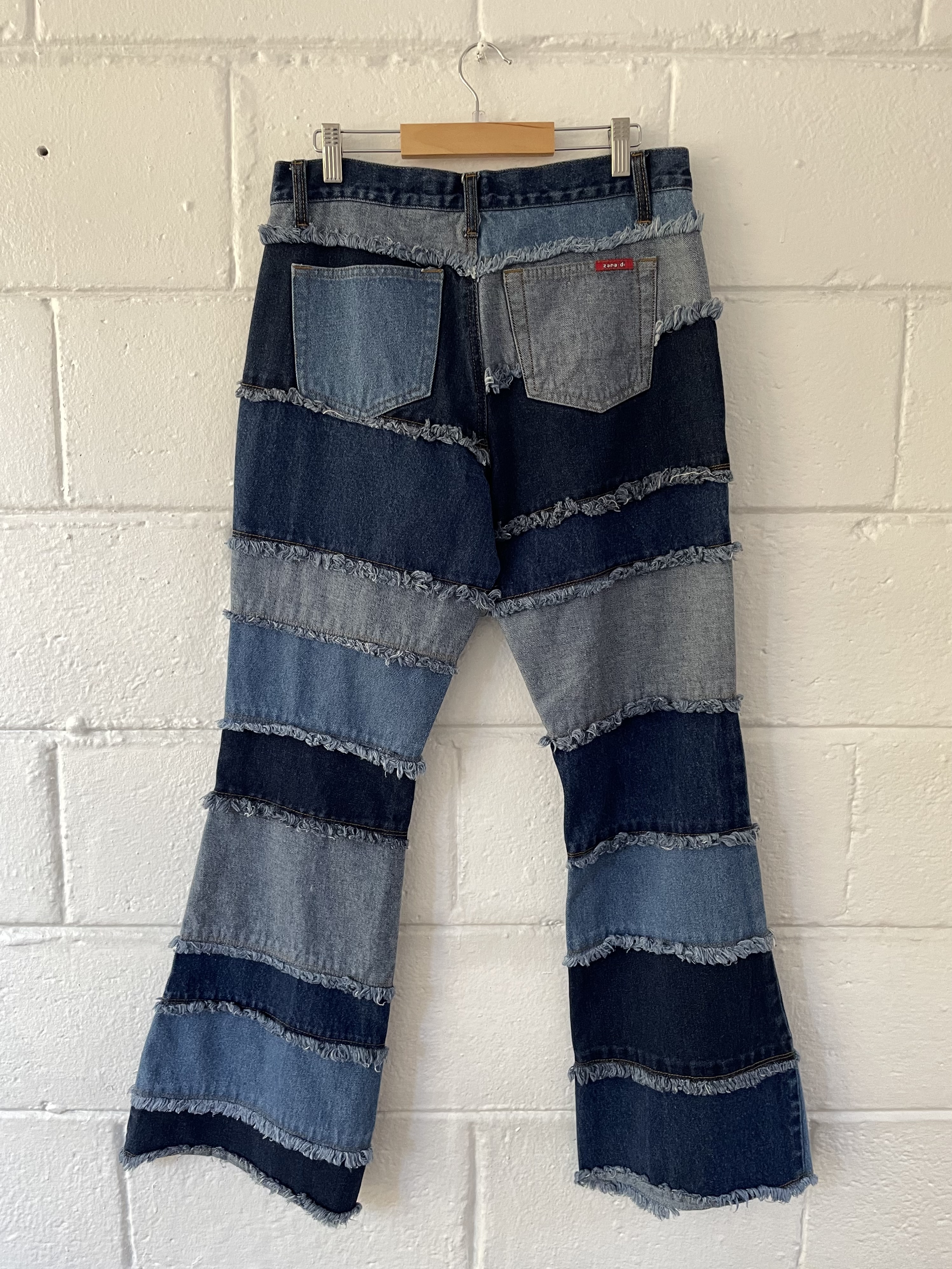 By Zana Di. Raw hem frayed patchwork denim pants with a mid rise and flare leg.