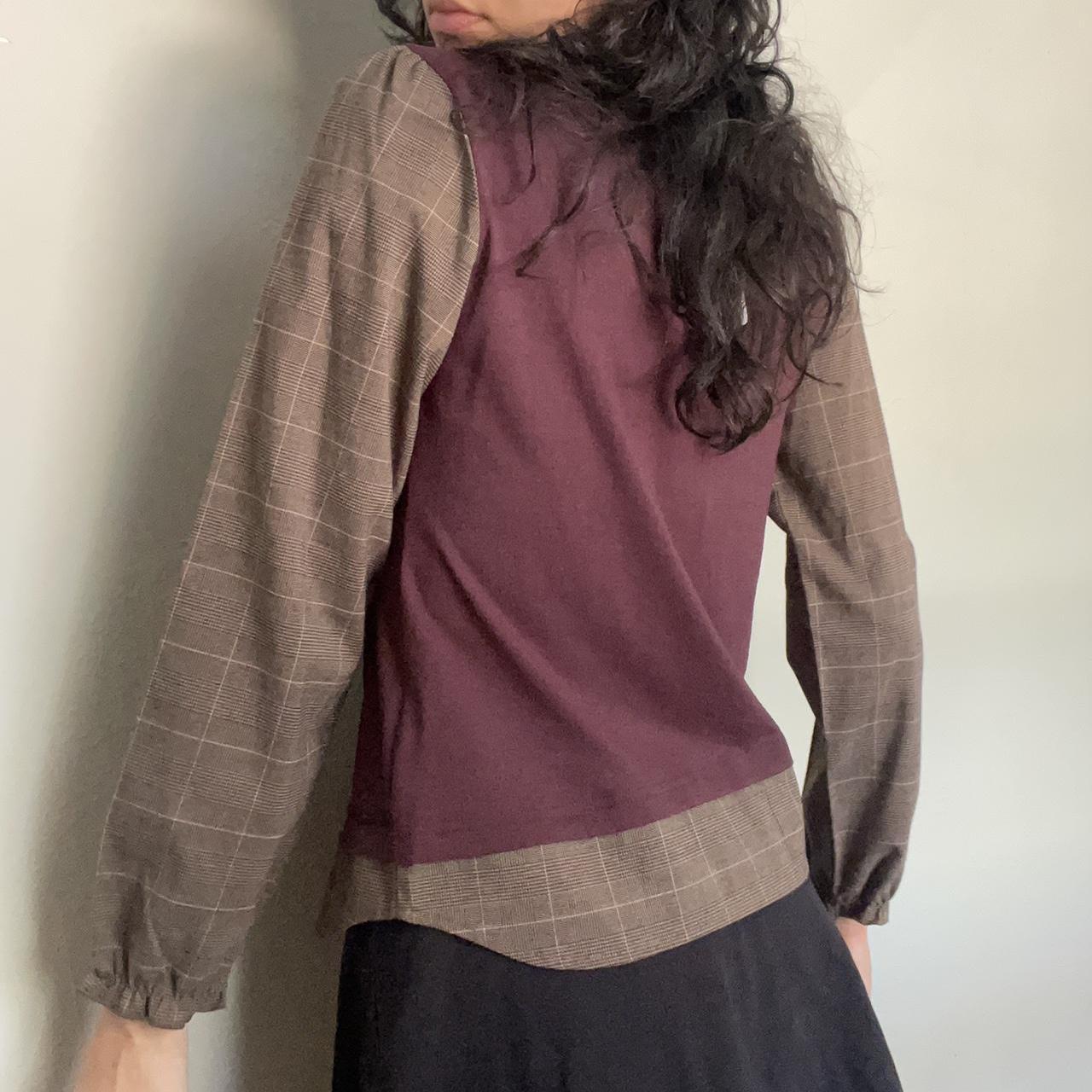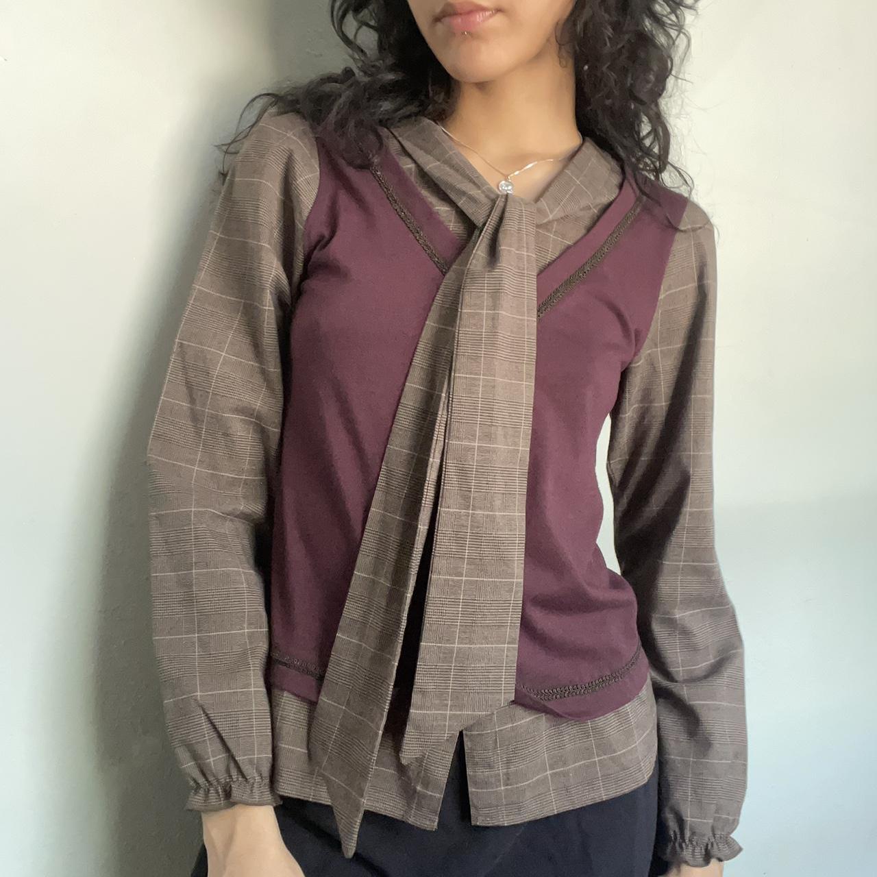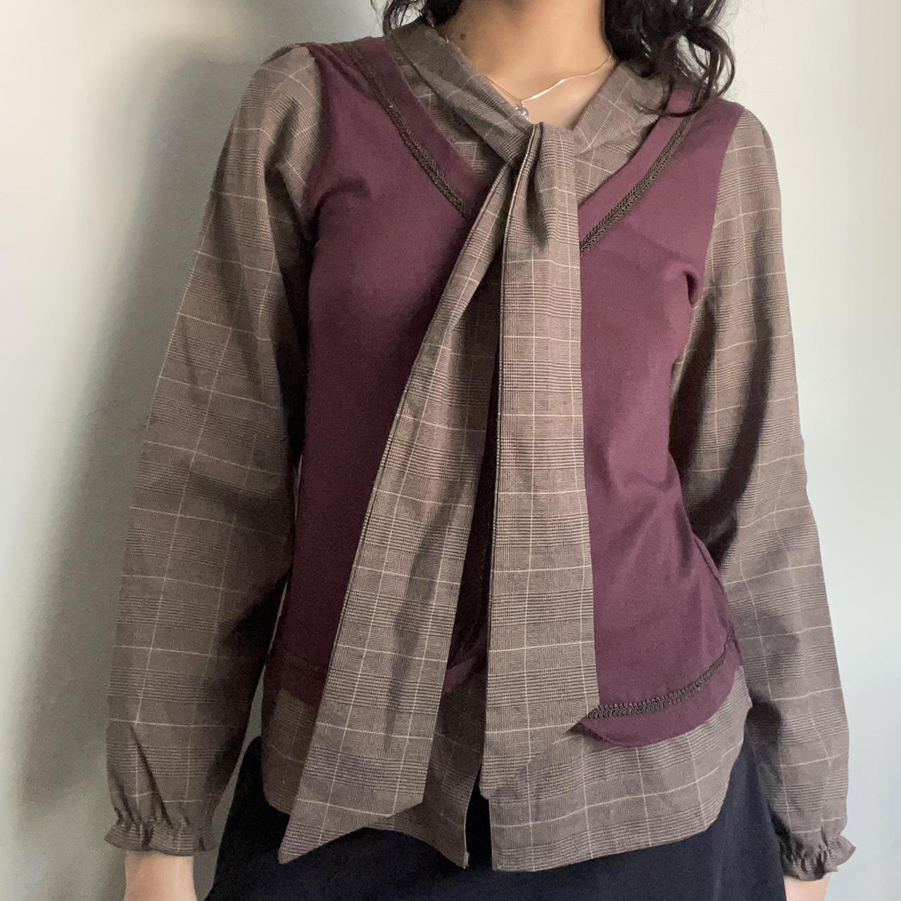 By Axes Femme. Japanese based brand. Soft brown plaid blouse with attached neck tie and red vest. Has brown faux button details. Ideal for S/M. Pictured on a 26” waist