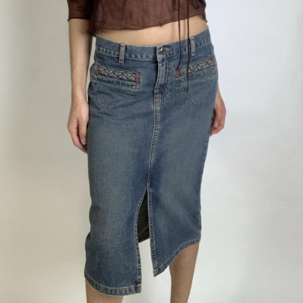 By Guess. Washed denim skirt with two braided details on front faux pockets.