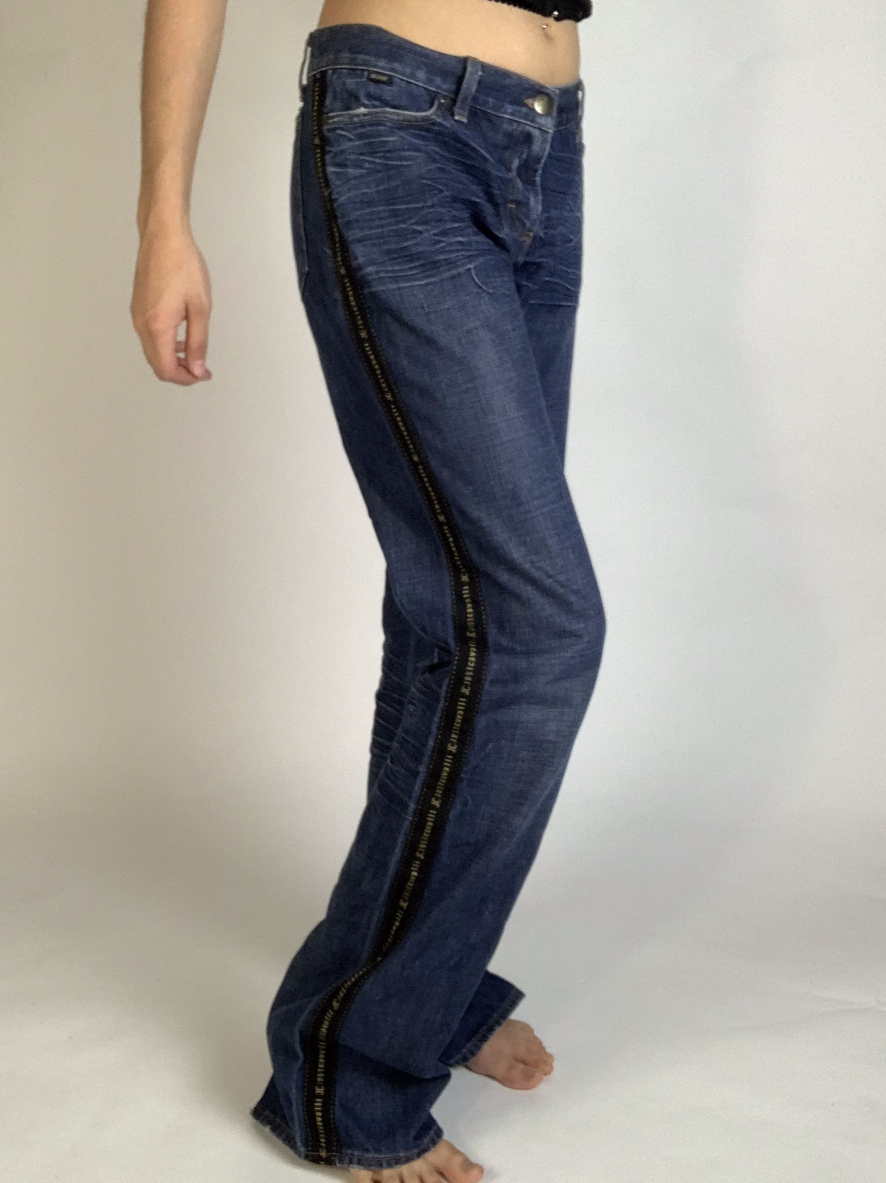 By Roberto Cavalli. 5 pocket style blue denim pants with a black spellout stripe down the leg. Straight bootcut leg