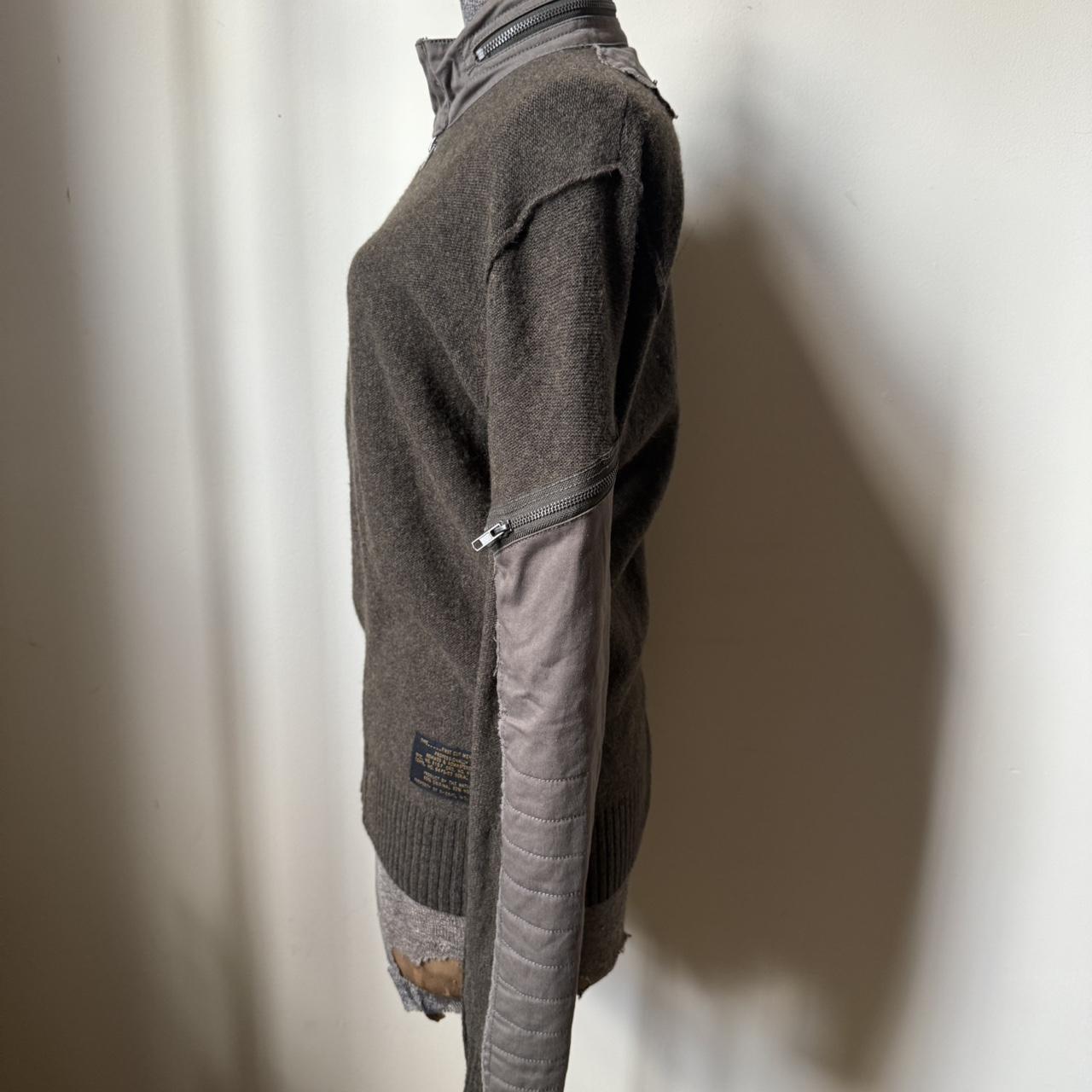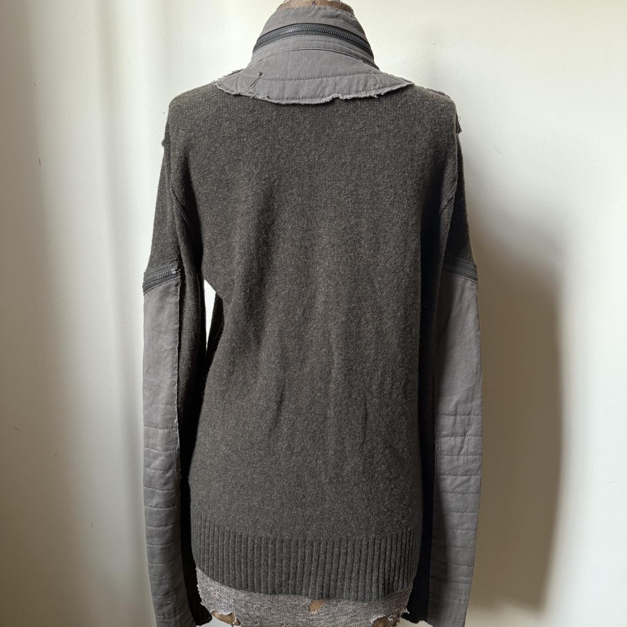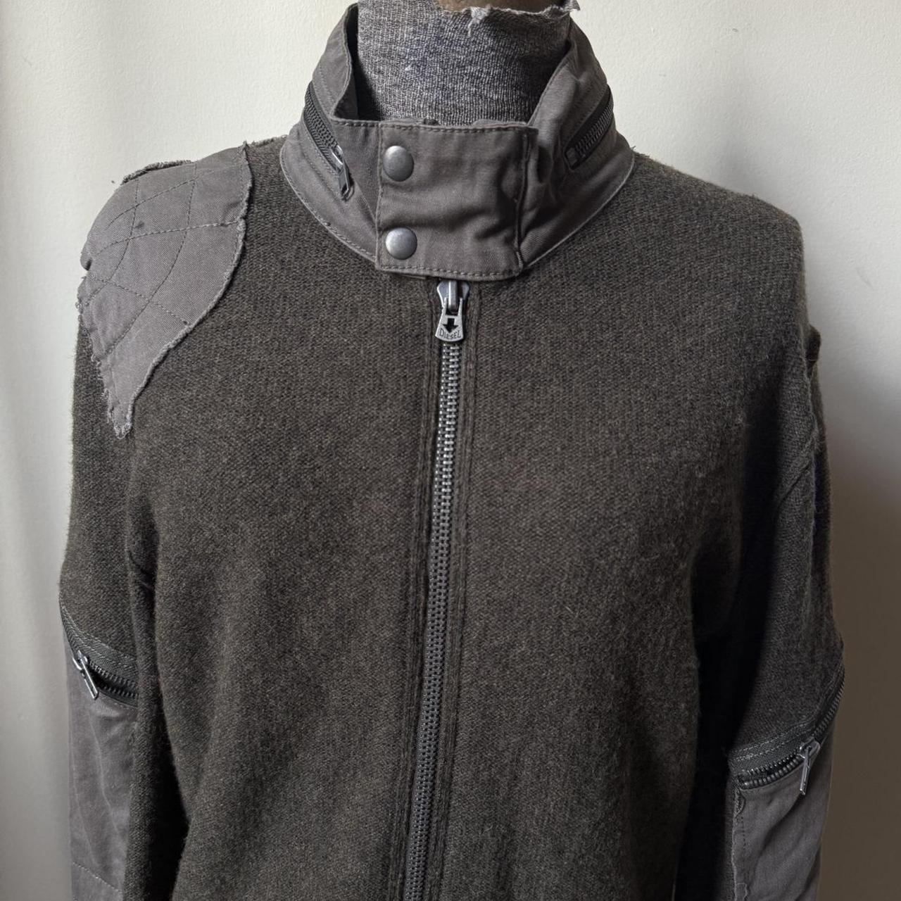By Diesel. Green zip front knit jacket with linen panel details. Made of wool/nylon knit blend and cotton panels. Labeled a size large, can fit M/L