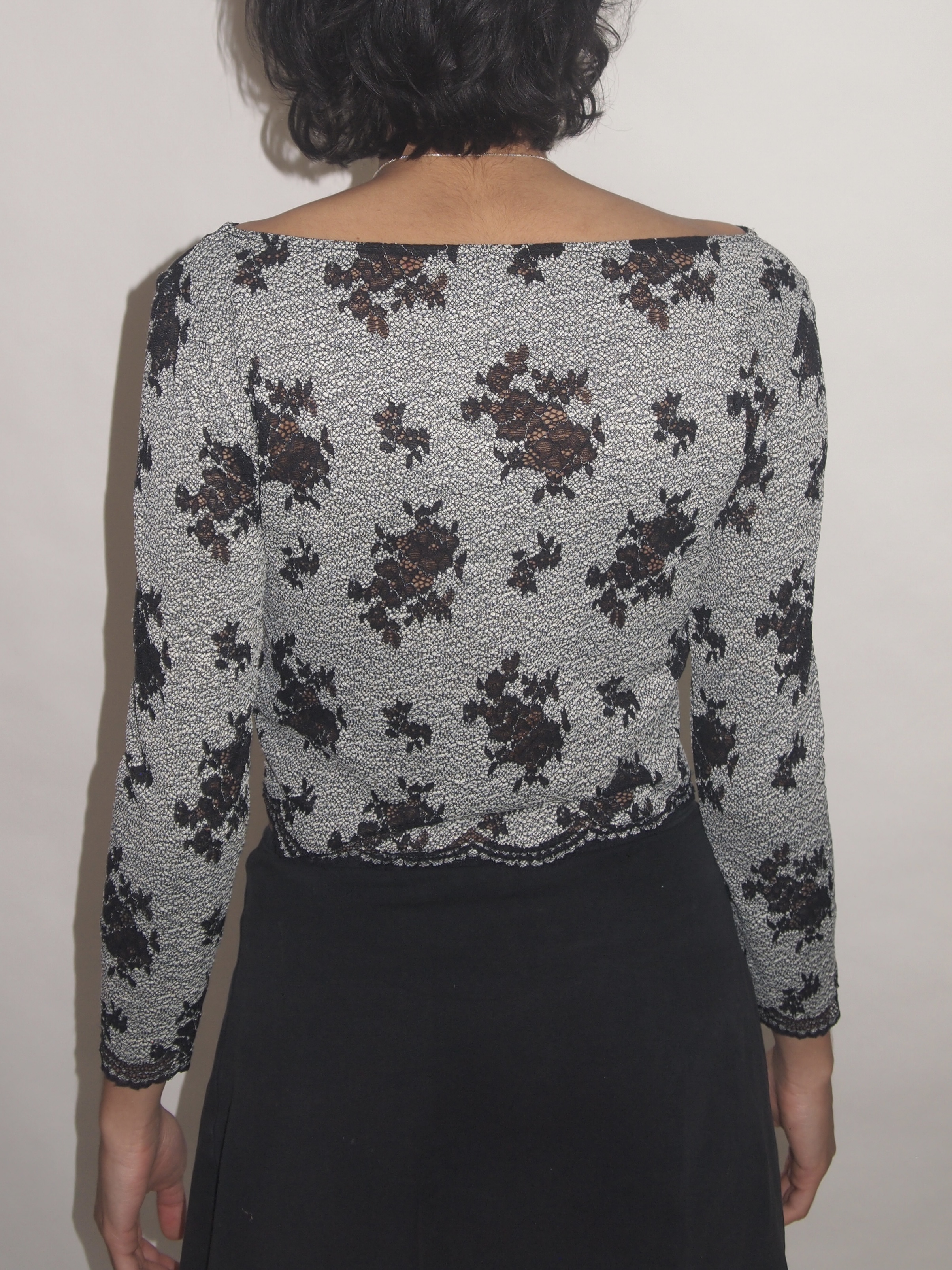 By Guess. Grey and black lace cropped blouse. With a silver signature Guess triangle logo silver hardware at the center chest. Has some stretch to it. Labeled a size small.