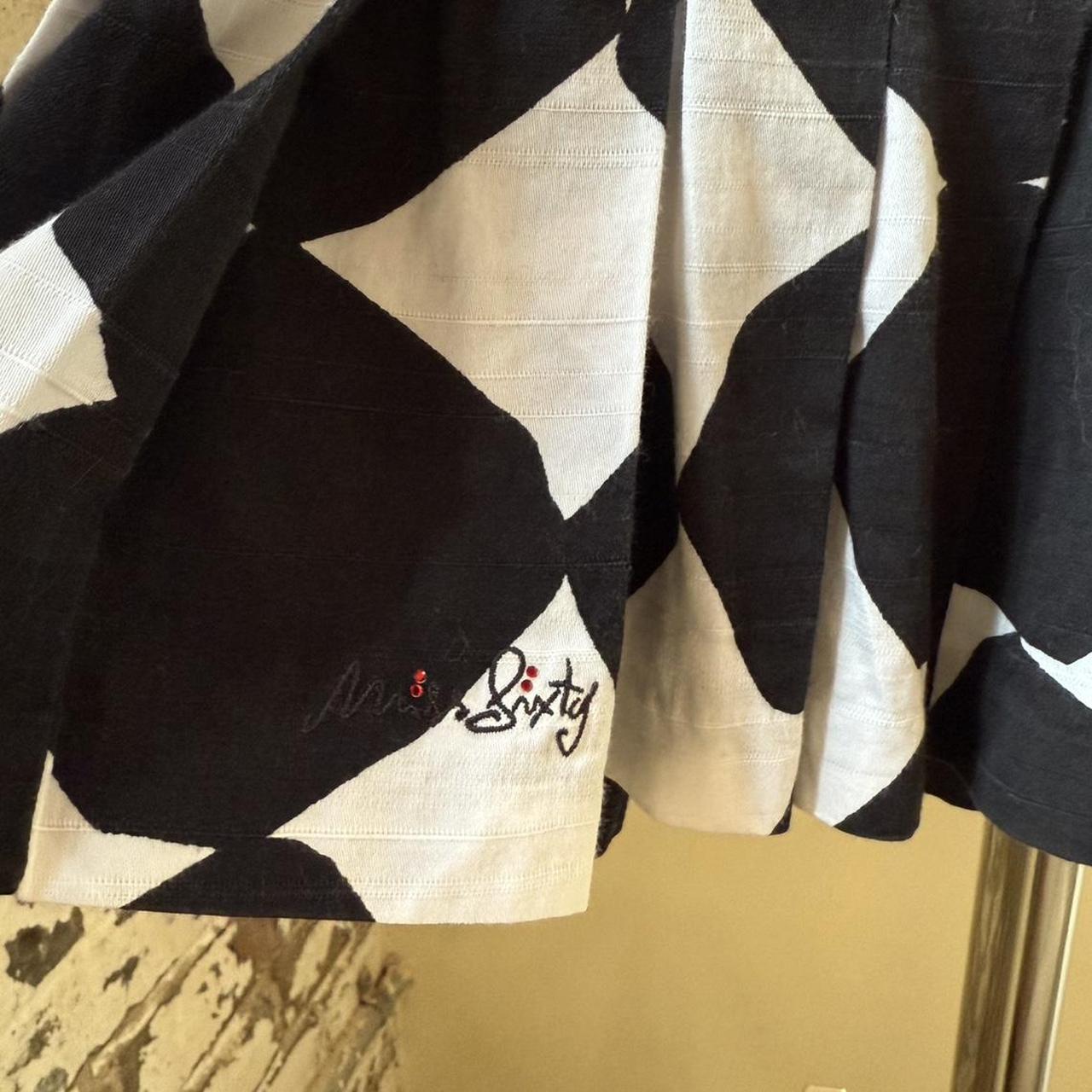 By Miss Sixty. Black & white rounded diamond print mini skirt. Spotted checkered print low rise micro mini skirt with built in shorts. Has a pleated skirt detail. Labeled a size small, fits XS/S