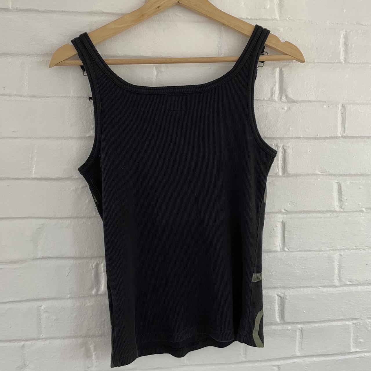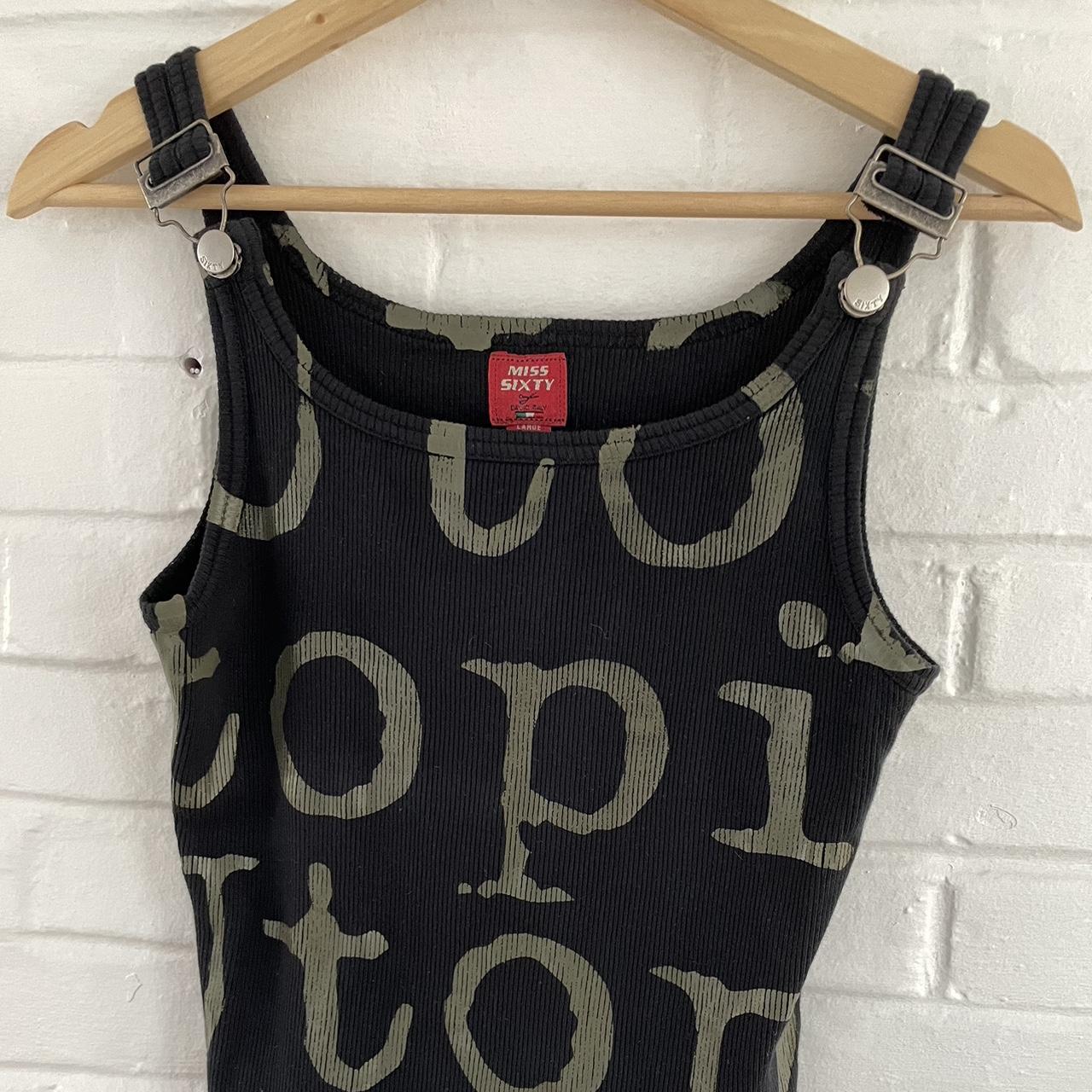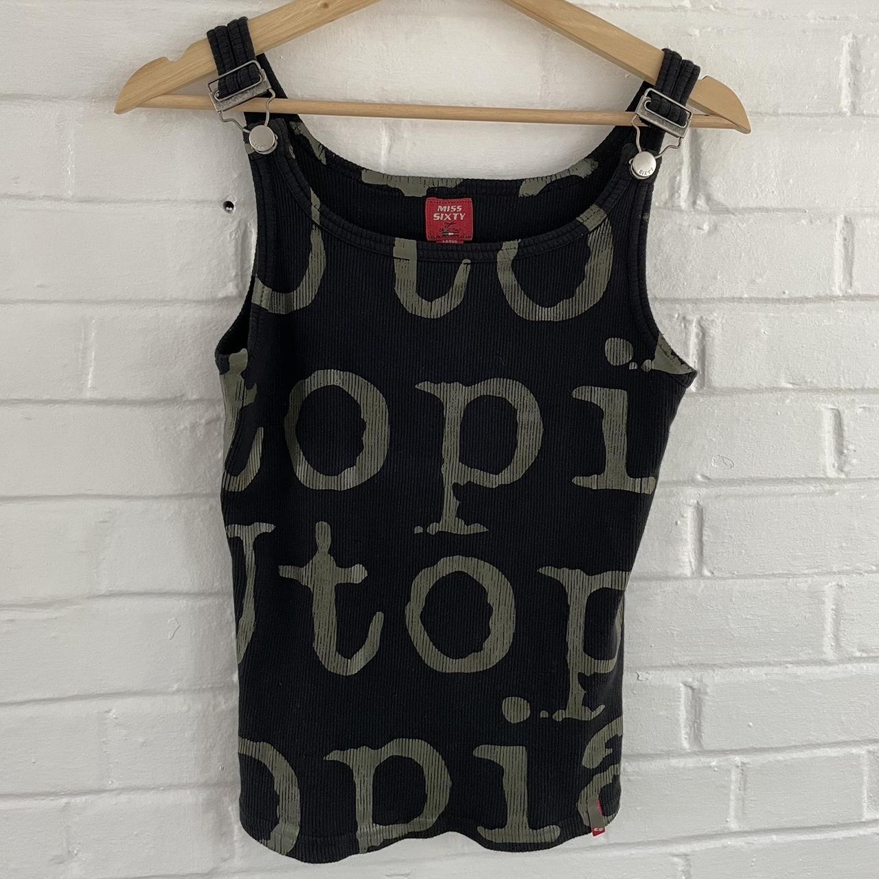 By Miss Sixty. ‘Utopia’ spellout print ribbed black overall clasp strap top. Labeled a size large