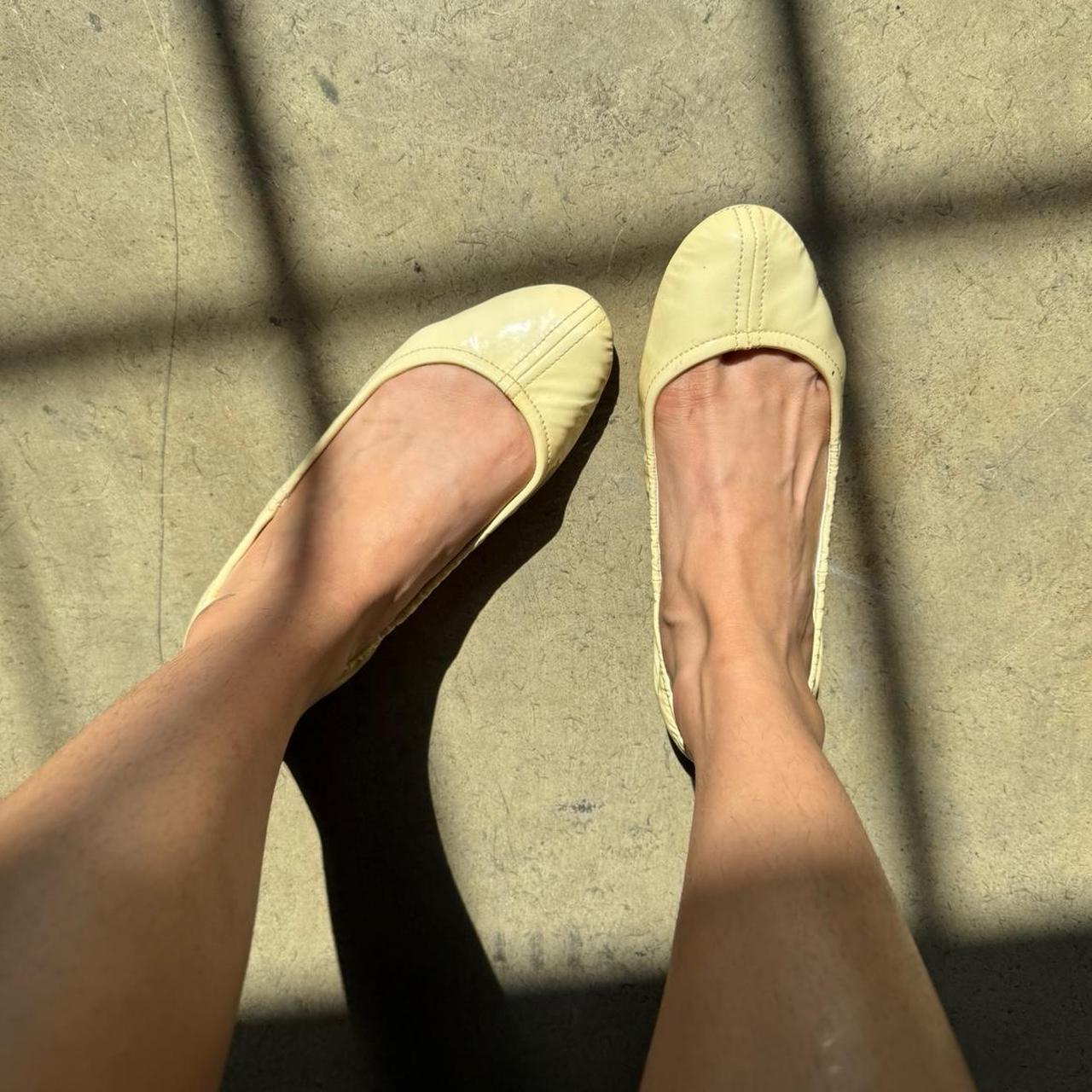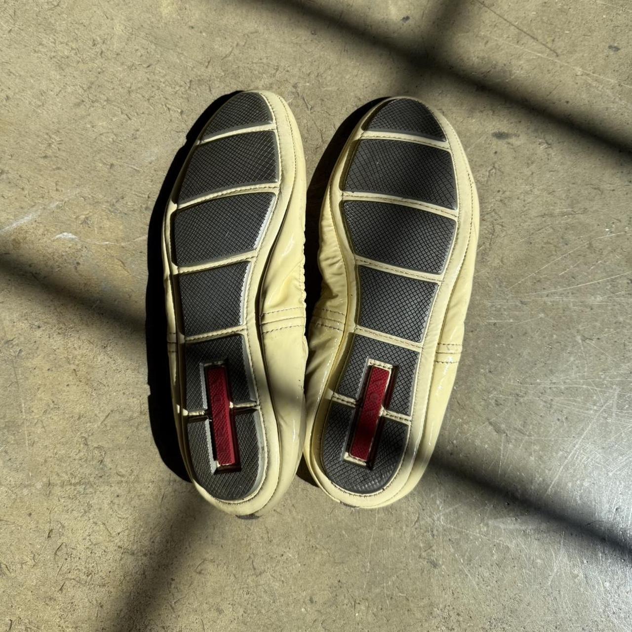 By Prada Sport. 90s cream off white patent leather ballet flats. Ideal for a size 7.5, can fit an 8 US W. Labeled a size EU 38