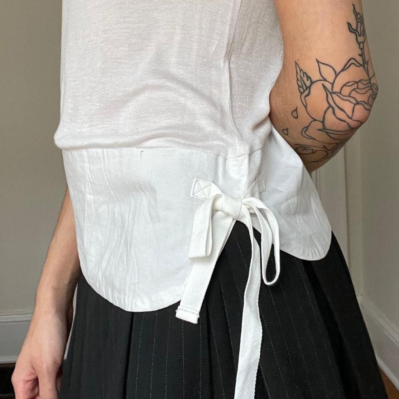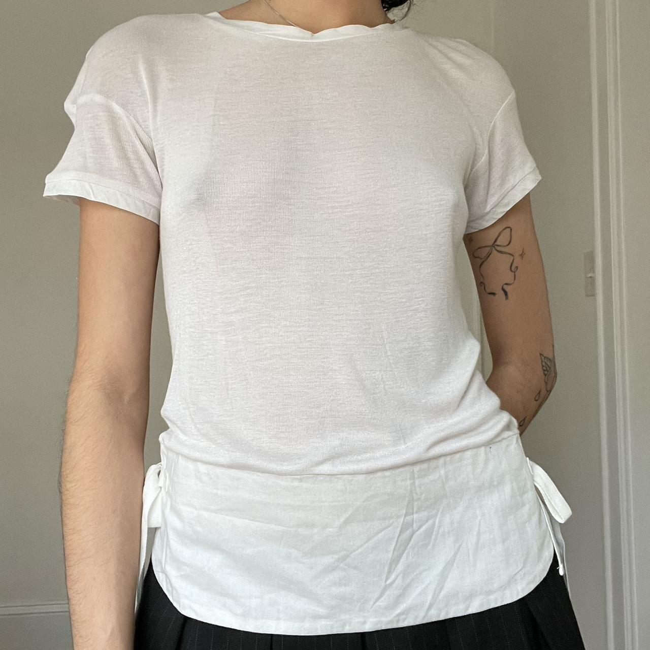 By See by Chloé. White tee with a round panel on the bottom hem and a side tie ribbon detail. Labeled a size 2, ideal for a size small